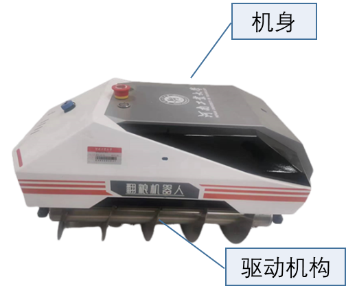 翻粮机器人包括机身、翻粮机构和驱动机构,驱动机构包括设置于机身底部两侧的螺旋推进杆,螺旋推进杆具有固定轴和螺旋叶片螺旋叶片固定轴上设置有用于随着螺旋叶片固定轴的旋转搅动粮食的挡板。